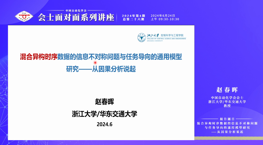 会士面对面 | 欧冠联赛官网会士、浙江大学/华东交通大学赵春晖教授:混合异构时序数据的信息不对称问题与任务导向的通用模型研究——从因果分析说起