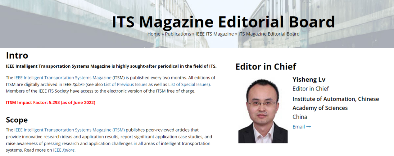 【喜报】祝贺学会会员吕宜生担任IEEE Intelligent Transportation Systems Magazine主编