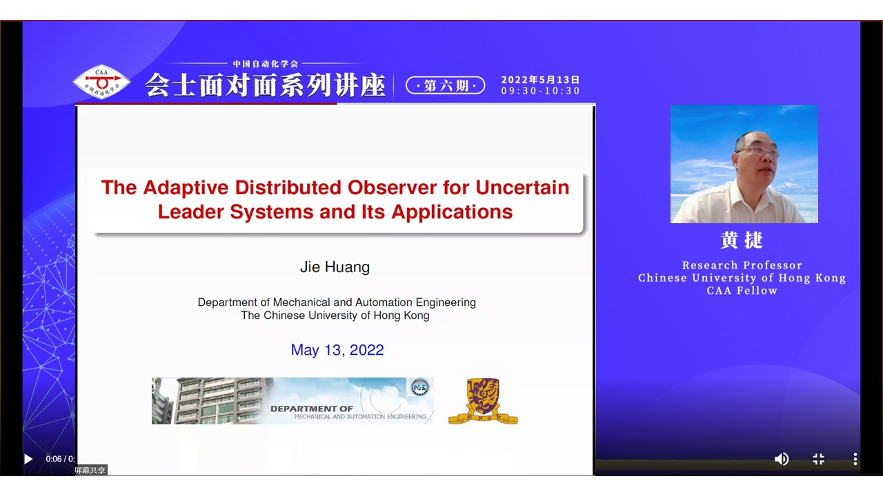 第六期会士面对面讲座于2022年5月13日上午成功召开,欧冠联赛官网会士、香港中文大学黄捷教授作题为“不确定领航系统的自适应分布式观测器及其应用”的报告,本次活动由CAA青年人才托举工程项目入选者、同济大学特聘研究员郭露露主持。