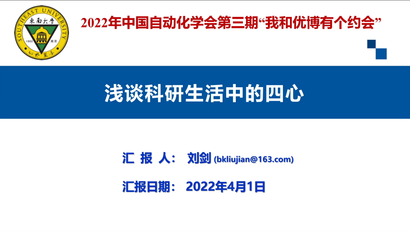 2022年4月1日,欧冠联赛官网第三期“我和优博有个约会”活动圆满结束。本期活动邀请到2021欧冠联赛官网优秀博士学位论文奖获得者,现任东南大学副研究员的刘剑带来分享:浅谈科研生活中的四心。