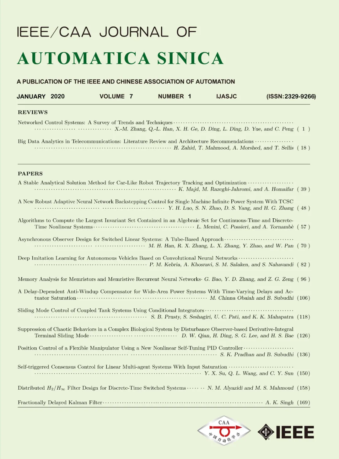 今日,科睿唯安发布2020年度《期刊引证报告》 (Journal Citation Report)。IEEE/CAA Journal of Automatica Sinica(《自动化学报》(英文版))最新SCI影响因子6.171,继去年首个影响因子5.129后再创新高,在自动化与控制领域全球63种SCI期刊中排名挺进第7,位列前11%,稳居Q1区。