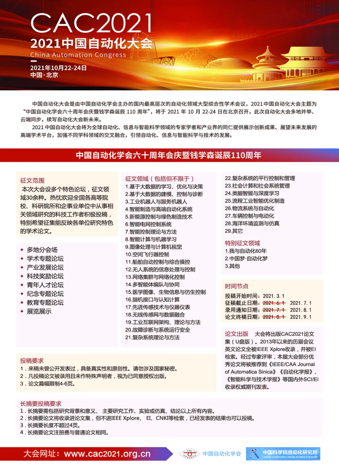 2021年3月1日,CAC2021网站正式上线,投稿系统正式开放,应广大科技工作者强烈要求,征稿延期至7月1日,征稿火热进行中,热忱欢迎各界人士投稿!