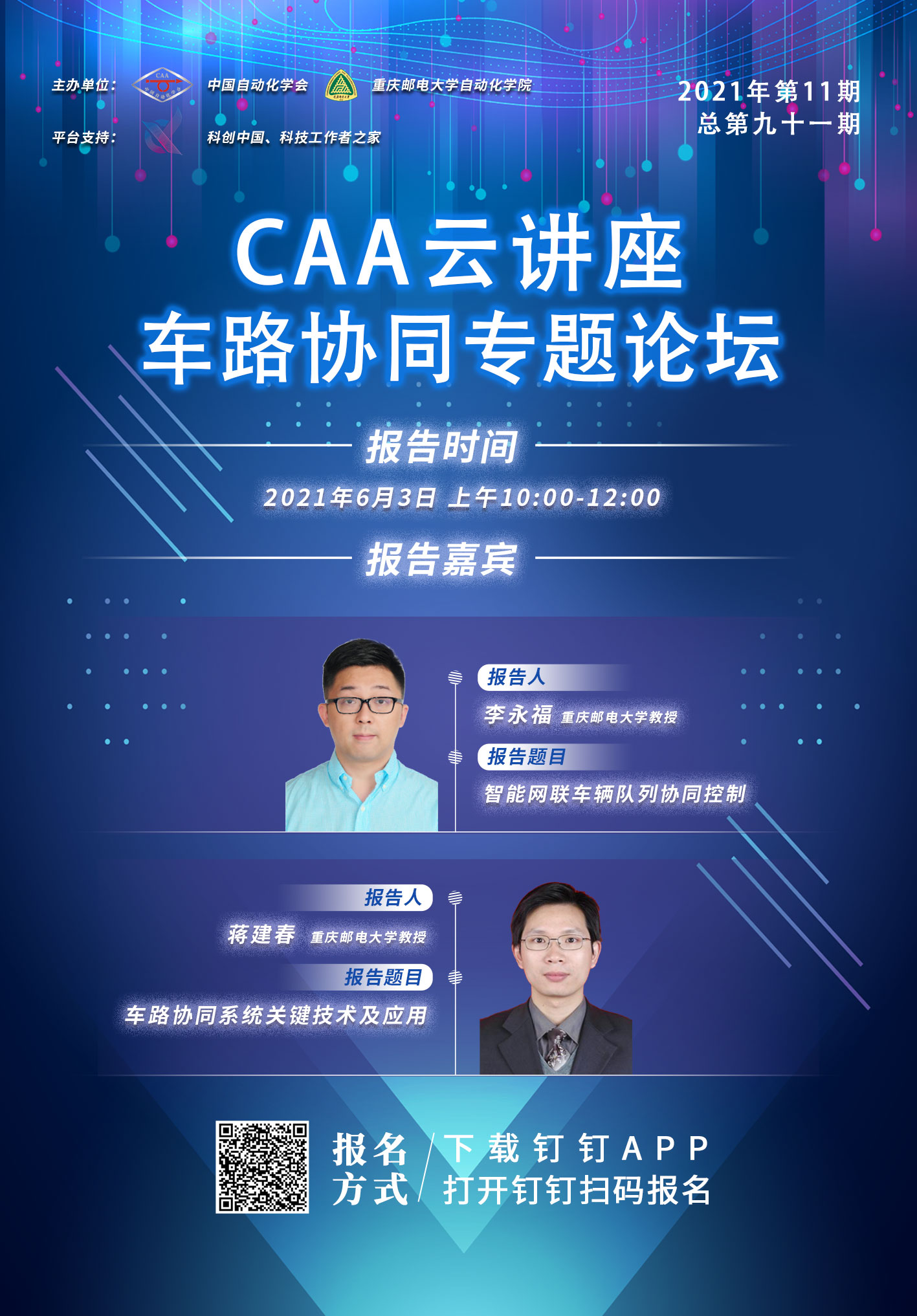 由欧冠联赛官网和重庆邮电大学自动化学院联合举办的CAA云讲座—车路协同专题论坛,将于2021年6月3日上午10:00-12:00举行。本次论坛由重庆邮电大学教授李永福带来报告“智能网联车辆队列协同控制”,重庆邮电大学教授蒋建春带来报告“车路协同系统关键技术及应用”。精彩内容,敬请期待!