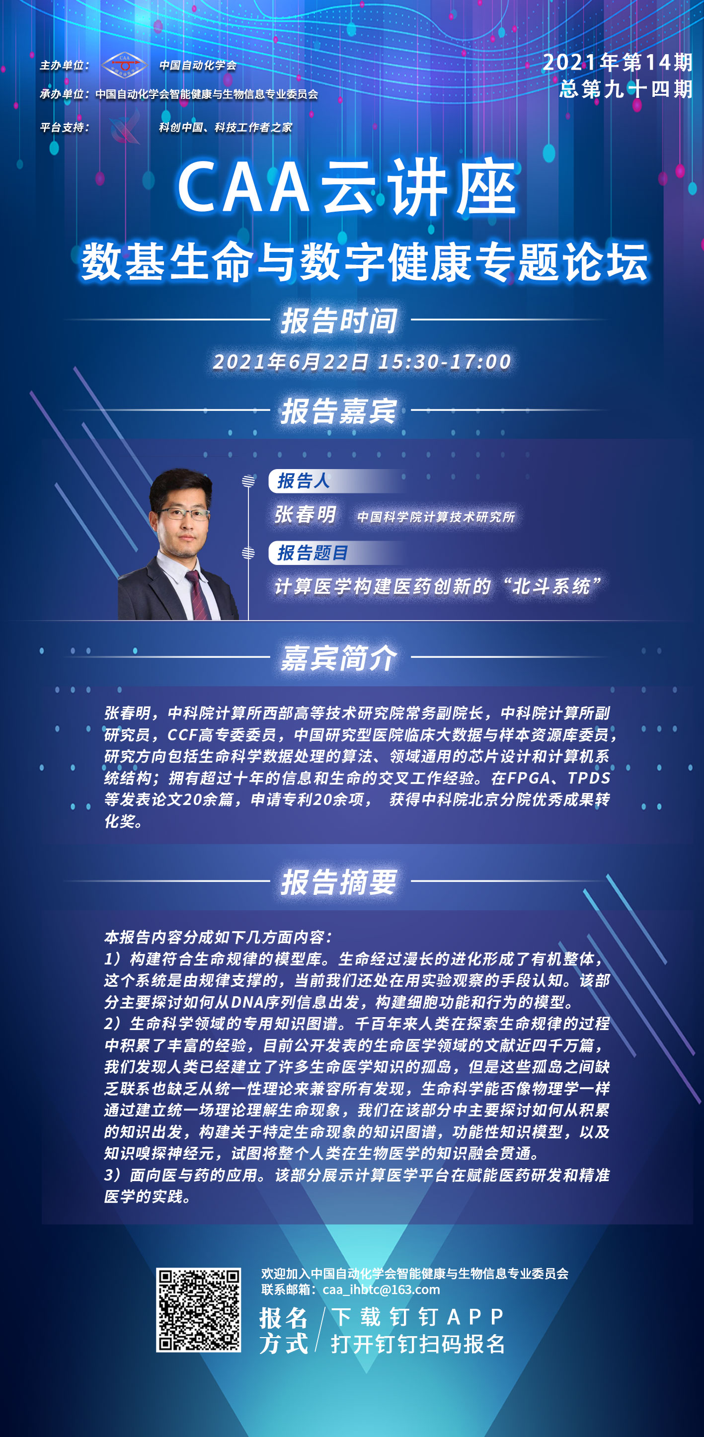 由欧冠联赛官网主办,CAA智能健康与生物信息专委会承办的CAA云讲座—数基生命与数字健康专题论坛第二场讲座,将于2021年6月22日下午15:30-17:00举行,由中国科学院计算技术研究所的张春明副研究员带来报告:计算医学构建医药创新的“北斗系统”。精彩内容,敬请期待!