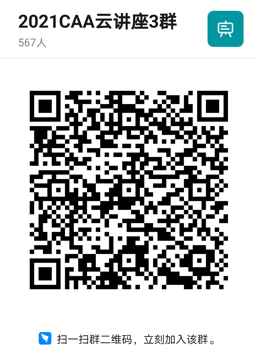 2、打开钉钉扫一扫,扫描下方二维码加入2021CAA云讲座3群(如您之前已经加入云讲座群,则不必再加入该群,届时将多群联播,任何一个群均可观看直播)。