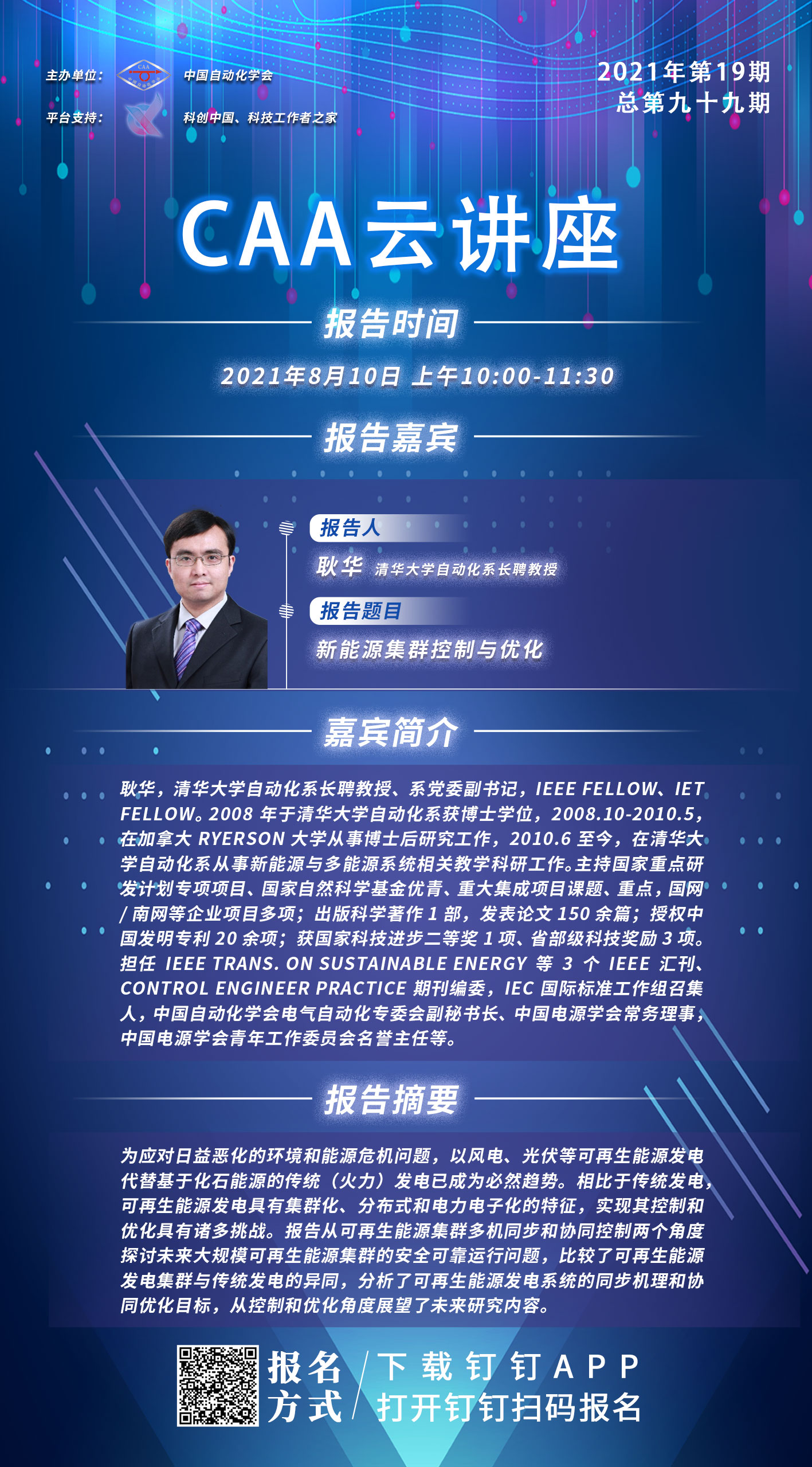 2021年欧冠联赛官网第十九期云讲座将于8月10日10:00-11:30开讲,本期云讲座邀请到清华大学自动化系长聘教授耿华,为大家带来报告:新能源集群控制与优化。精彩内容,敬请期待!