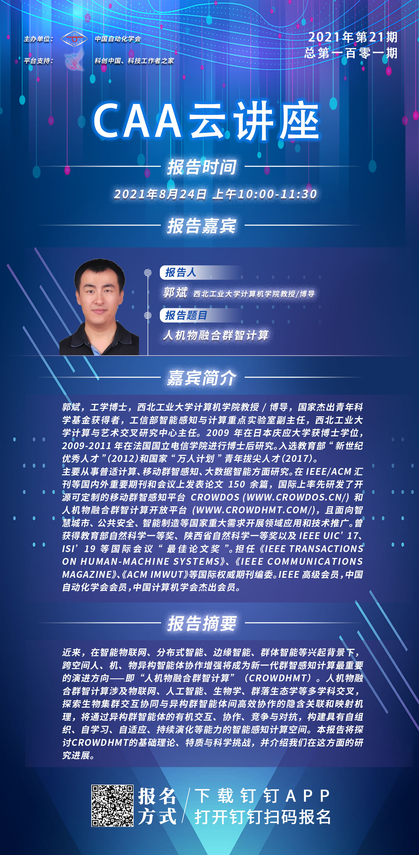 2021年欧冠联赛官网第二十一期云讲座将于8月24日10:00-11:30开讲,本期云讲座邀请到西北工业大学郭斌教授,为大家带来报告:人机物融合群智计算。精彩内容,敬请期待!