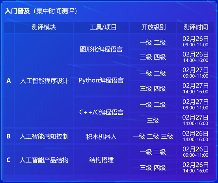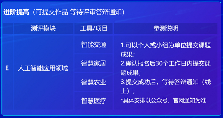本期测评开放了四大模块共9个项目,四大模块包括人工智能程序设计、人工智能感知控制、人工智能产品结构三个入门普及性测评模块,以及一个进阶提高性测评模块——人工智能应用领域(包括智慧交通、智慧家居、智慧医疗和智慧农业),这个模块的测评需要个人或小组提交课题成果并参加答辩,之后由专家组进行评审。
