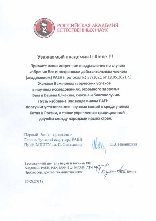 近日,俄罗斯自然科学院(Russian Academy of Natural Sciences,RAEN)O.L.Kuznetsov院长向欧冠联赛官网会员、东南大学自动化学院李新德教授发来贺信,祝贺他当选为俄罗斯自然科学院外籍院士。
