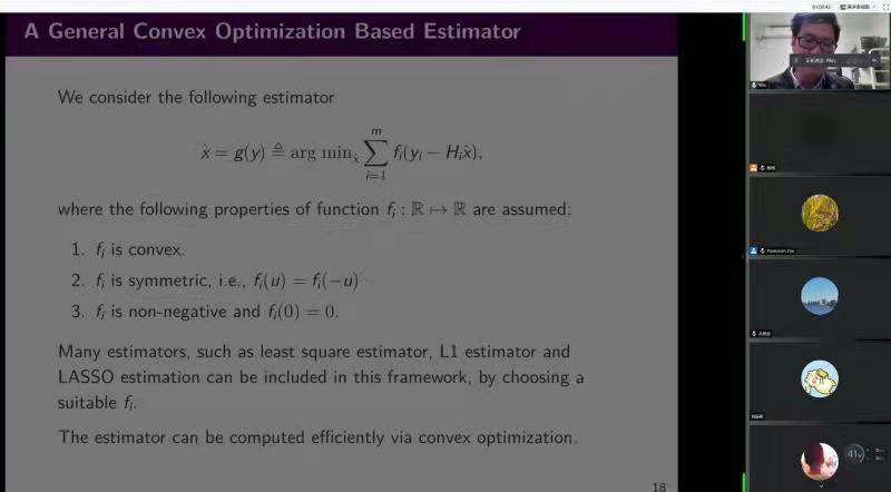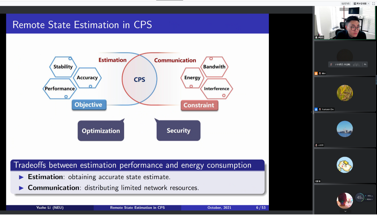 东北大学李渝哲教授做了题为“Remote State Estimation in Cyber-Physical Systems: from Power Control to Security”的报告。李教授介绍了其课题组近期在功率控制以及远程状态估计问题中的最新研究进展,提出了基于马尔可夫博弈理论的最有估计与信息传输策略的设计方法。