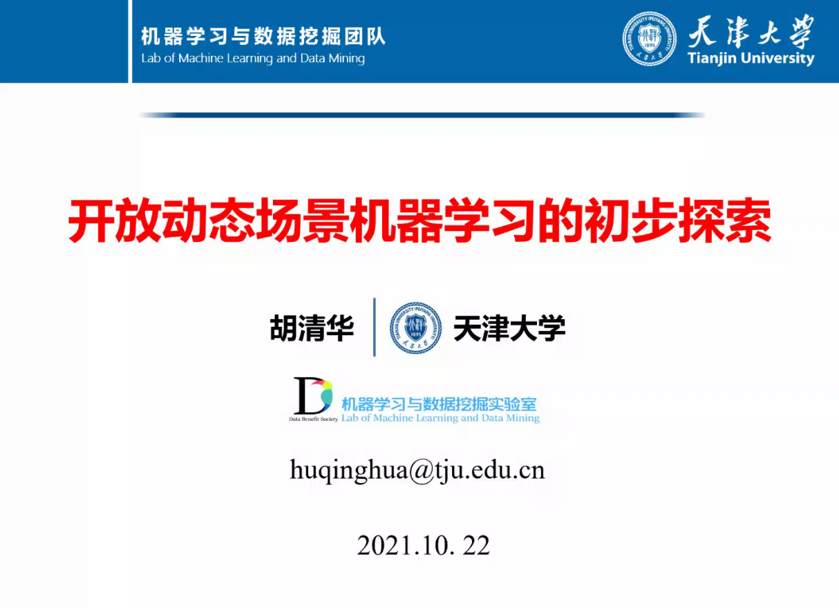 胡清华教授的报告题目是“开放动态场景机器学习的初步探索”。胡教授首先介绍研究背景,指出目前机器学习适用于固定封闭环境,当面临开放动态场景时,多模态数据存在较强不确定性、关联关系存在动态变化,数据呈现长尾分布而尾部不易建模,测试过程中新样本不断涌现,样本多样性和多样性对抗策略使模型失效。针对上述问题,胡教授介绍最近的研究重点及成果,包括多模态数据动态融合、长尾数据的多粒度迁移学习、开放场景的自主学习和选择则性资助学习。