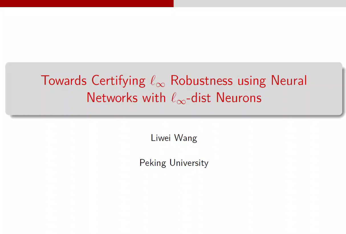 王立威教授的报告题目是“应用ℓ∞-距离神经网络验证ℓ∞鲁棒性”。王教授由对抗鲁棒性研究入手,分析噪声对深度神经网络重要影响,发现深度学习对微小对抗扰动异常敏感。王教授致力于寻找能够抵抗ℓ∞波动的新型神经网络,设计ℓ∞-距离神经元,基于该神经元的网络是关于ℓ∞范式的1-Lipschitz函数,这严格保证基于输出结果边沿的认证鲁棒性。该网络的Lipschitz常数小于等于1,围绕该网络开展进一步研究,在MNIST、CIFAR-10、TinyImageNet三个常用数据集上的指标表明该网络具有良好的性能。