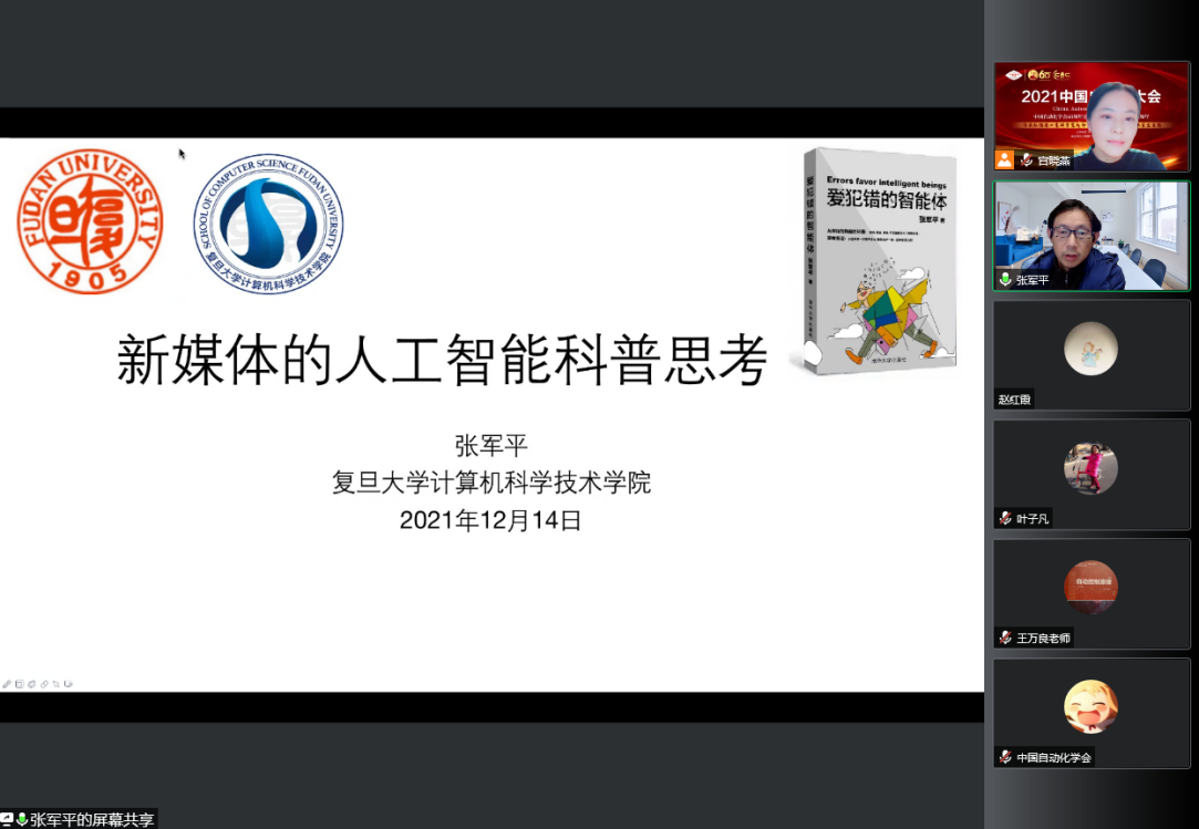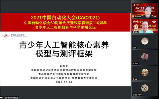 2021年12月14日,以“青少年人工智能教育与科学传播”为主题的2021中国自动化大会综合专题论坛,在线上顺利召开。本次专题论坛由CAA智慧教育专委会和CAA普及工作委员会联合承办,欧冠联赛官网理事、智慧教育专委会主任、浙江工业大学王万良教授和欧冠联赛官网理事、普及工作委员会主任、复旦大学张军平教授共同担任主席。论坛由CAA普及工作委员会秘书长宫晓燕博士主持,论坛邀请了7位报告嘉宾齐聚线上,与人工智能专家学者、技术领军者、教育实践者,共同探讨面向K-12及高校的人工智能课程体系、课程设计、教学案例、科普资源、核心素养、大赛测评等科学前沿热点,推动新时期的人工智能教育与科学传播。
