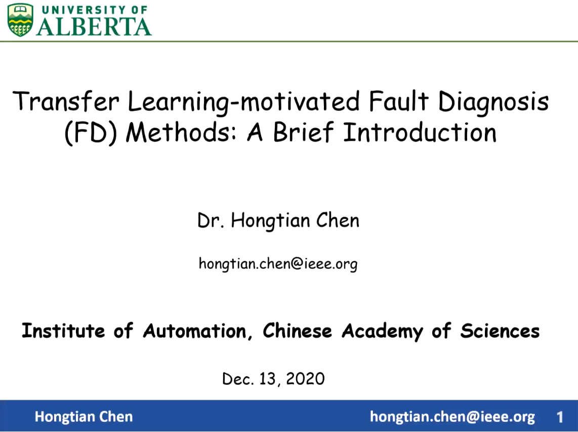 第一位报告人是来自加拿大阿尔伯特大学的陈宏田博士,他报告的题目是“Transfer Learning-motivated Fault Diagnosis (FD) Methods: A Brief Introduction”。报告介绍了基于迁移学习的故障诊断方法,对这种方法的优越性进行了详实的介绍,并从知识折中与知识校准这两方面,对该方法的本质进行了揭示,同时展望了未来的发展趋势。