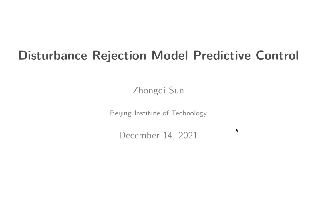 第六位报告人是来自北京理工大学的孙中奇副研究员,他报告的题目是“Disturbance Rejection Model Predictive Control”。报告中针对在约束和干扰存在的条件下,模型预测控制(MPC)中优化问题的迭代可行性可能会丧失,甚至导致系统不稳定的问题。提出了一种基于扰动观测器的抗扰MPC,从而在一定程度上弥补了传统鲁棒MPC的不足之处,同时为具有非完整约束特性的车辆系统,设计了一套抗扰MPC方案,提高了车辆的跟踪精度。