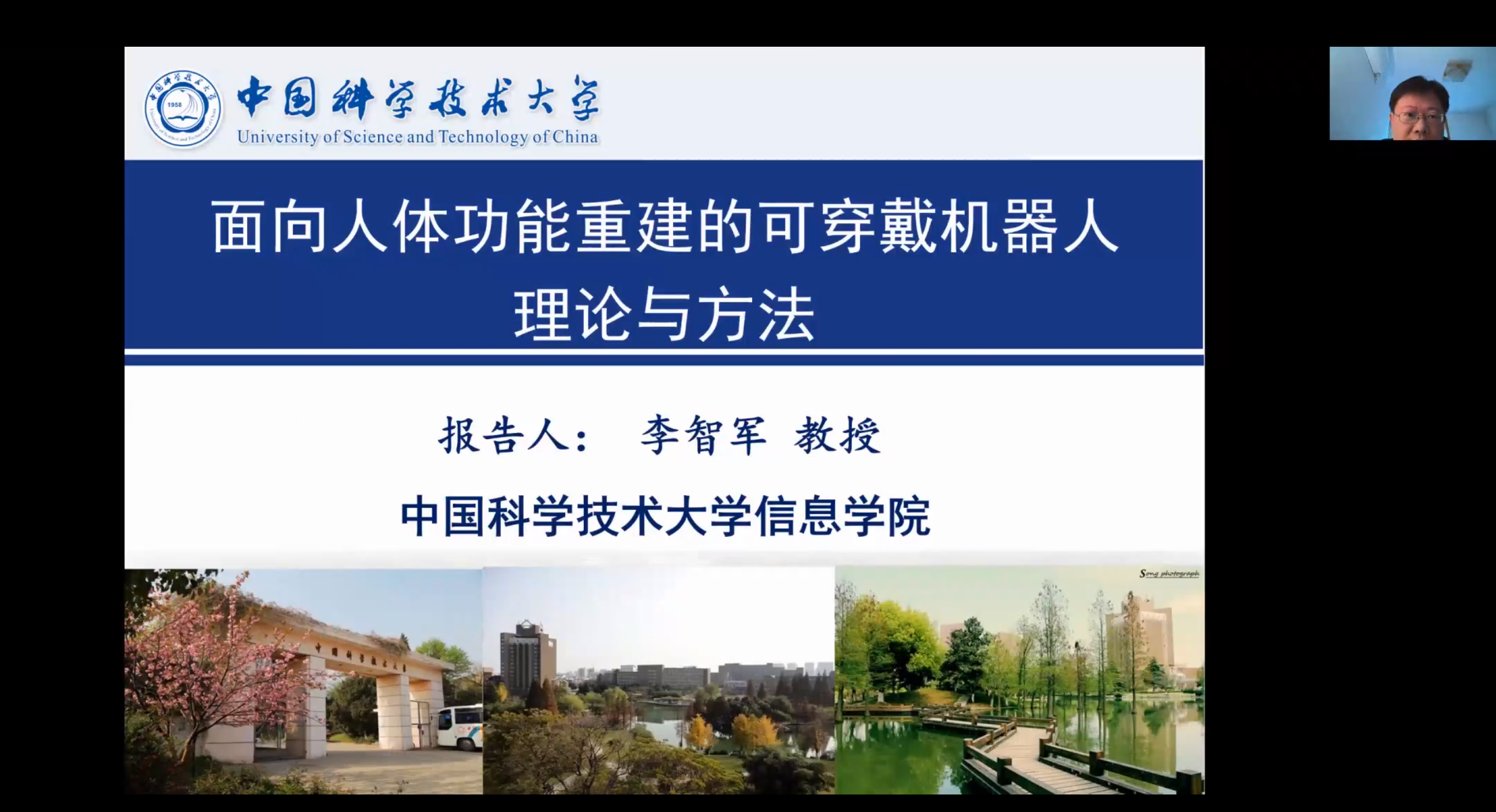 第一位报告人为来自中国科学技术大学的李智军教授,报告题目为“面向人机合作混合智能的可穿戴机器人控制理论与方法”。报告中,针对老龄化、心脑血管或神经系统疾病和意外伤害造成的肢体损伤患者,李教授对可穿戴机器人的控制理论与方法展开了长期攻关,解决了如下四大科学问题:操作主体的运动意图认知、人机技能传递机理与变刚度控制、人在环中的人机强耦合控制优化以及面向控制安全的操作主体人机验证。
