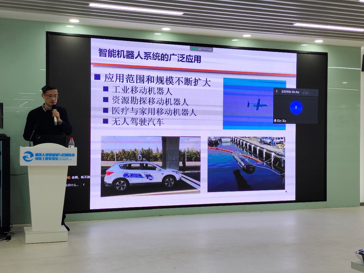 第二位报告人为来自国防科技大学的徐昕教授,报告题目为“机器人自学习优化控制理论与技术的研究进展”。报告中,徐昕教授分析了机器人和无人系统由于动力学模型复杂性和不确定性带来的优化控制问题,介绍了机器人自学习优化控制技术的若干研究进展,包括结合近似策略迭代的自学习 PID 控制方法、多核在线学习控制方法、学习型预测控制方法等;特别是针对学习型预测控制,分别讨论了基于模型学习的预测控制和基于强化学习的预测控制研究进展。针对地面无人系统的优化控制问题,给出了有关自学习优化控制的仿真和实验结果,最后对未来的研究方向进行了分析和展望。