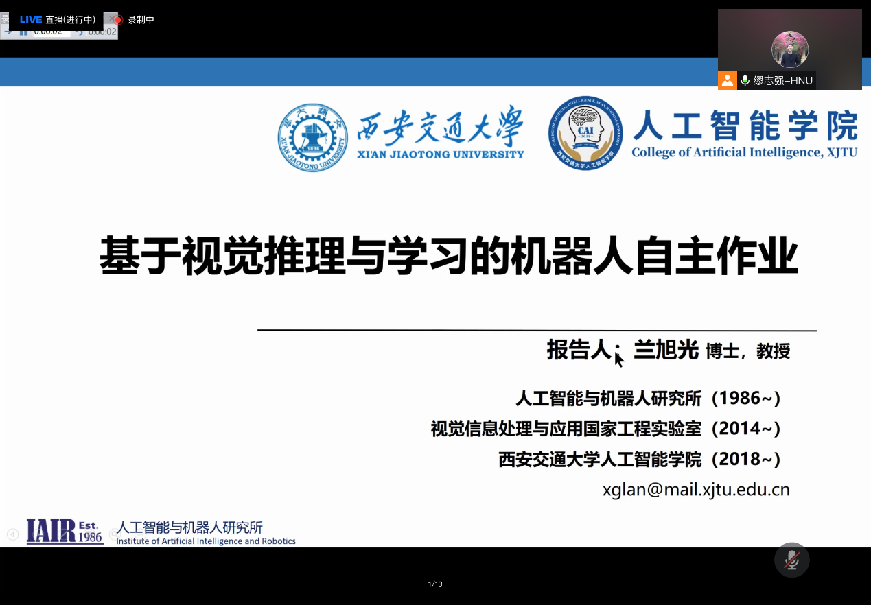 第八位报告人为来自西安交通大学的兰旭光教授,报告题目为“基于视觉推理与学习的机器人自主作业”。报告中,兰旭光教授介绍了机器人在智能方面的进展和面临的挑战,特别是人机协作中机器人对非结构场景的自主理解、学习和作业的难点。针对这些问题提出了一种基于视觉推理与学习的自主作业方法。在部分可观测场景下,将学习与规划(POMDP)进行交互迭代,使得机器人能够对动态非结构场景进行理解并完成特定物体的作业。报告同时还将介绍机器人自主学习等方面的进展,提出了基于经验回放的信赖域策略优化方法,提升了稀疏奖励下机器人自主学习的性能。