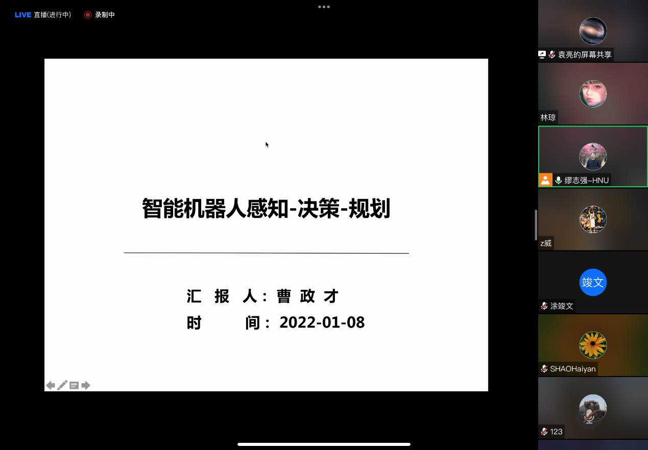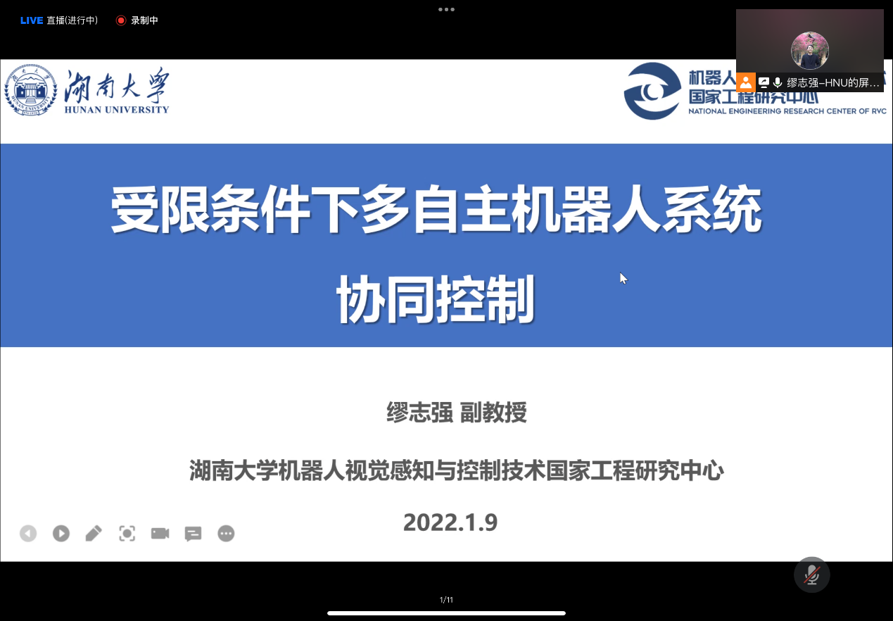 第二十五位报告人为来自湖南大学的缪志强副教授,报告题目为“受限条件下多自主机器人系统协同控制”。报告中,缪教授针对复杂环境下多移动机器人和无人机协同控制问题,主要介绍两类受限条件下的协同控制方法:视觉反馈控制和无速度反馈控制。最后,对多机器人协同控制系统的未来研究方向和发展趋势进行了展望。
