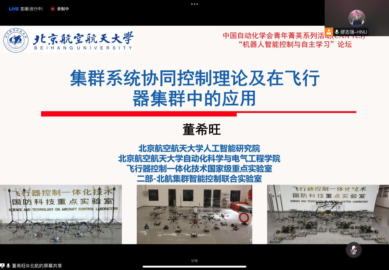 第十一位报告人为来自北京航空航天大学的董希旺教授,报告题目为“集群系统协同控制理论及在飞行器集群中的应用”。报告中,董希旺教授主要针对集群系统协同控制中的分布式时变编队控制技术、编队跟踪控制技术及编队-合围控制技术进行分别介绍,并结合在无人机集群上的系列飞行试验对所提出技术的有效性进行演示验证,最后以所参加的空军“无人争锋”智能无人机集群系统挑战赛密集编队穿越竞速的比赛为例进行应用展示,并对未来的可能发展方向进行概述。