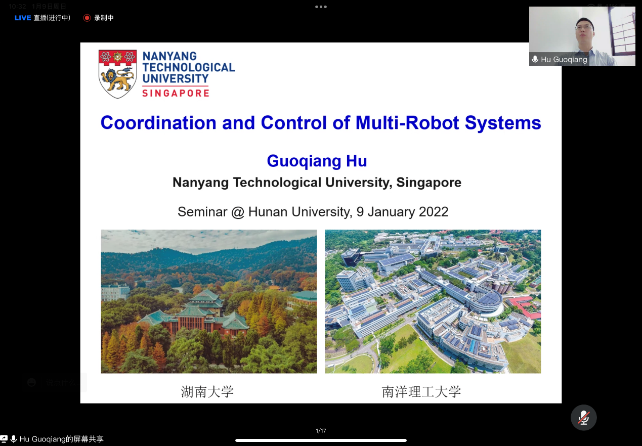 第十六位报告人为来自新加坡南洋理工大学的胡国强教授,报告题目为“Coordination and Control of Multi-Robot Systems”。报告中,胡国强教授首先简要回顾多机器人系统,然后介绍了多机器人协调的分布式算法和控制方法的一些最新研究成果和相关应用情况。
