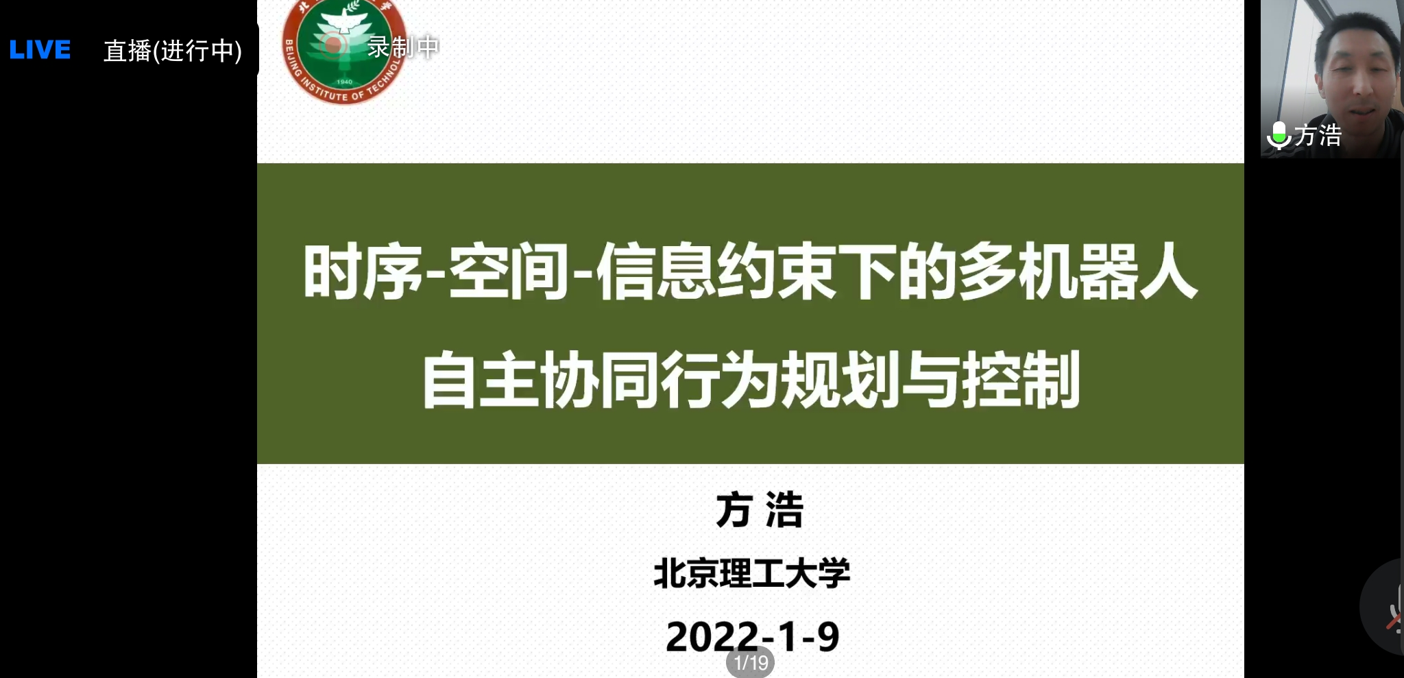 第十九位报告人为来自北京理工大学的方浩教授,报告题目为“严格时序-空间-信息约束下的多机器人自主协同行为规划与控制”。报告中,方浩教授在回顾了现有多机器人协同技术的基础上,针对实际协同任务中的严格时序-空间-信息约束,从信号时序逻辑约束下的协同行为规划,空间-能量约束下的分布式协同优化控制,弱化信息条件下的动态自适应编队控制等方面分别介绍了多机器人自主协同行为规划与控制的最新研究进展,分析了自主协同的技术内涵,凝练出制约其技术突破的若干核心关键问题,并给出具有创新性的解决之道。最后对多机器人自主协同行为规划与控制的发展趋势做出预测,以期对相关研究起到借鉴和引导作用。