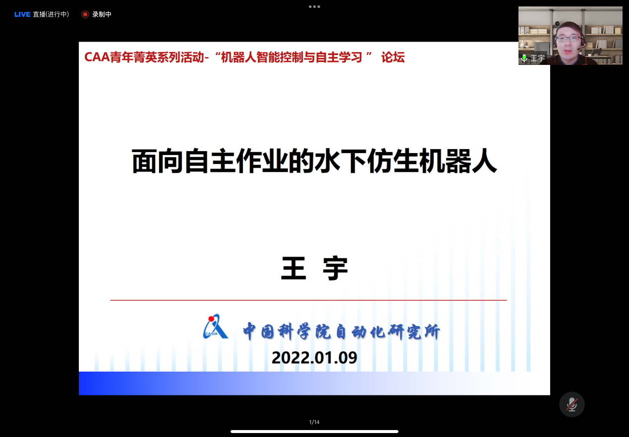 第二十二位报告人为来自中国科学院自动化研究所的王宇研究员,报告题目为“面向自主作业的水下仿生机器人”。报告中,王宇研究员详细阐述了水下机器人的广泛应用,以及其系统设计、控制等方面面临的许多亟待解决的难题,并提出相比于螺旋桨推进的潜器平台,综合水下仿动物推进模式的优点而设计的新型潜器平台将为解决 UVMS 系统的悬停、水动力干扰等难题提供新的研究思路、方案和路线。报告主要围绕水下目标的精准作业控制问题,具体介绍水下机器人的仿生设计、自主环境感知、运动控制和抓取作业控制等方面研究工作。