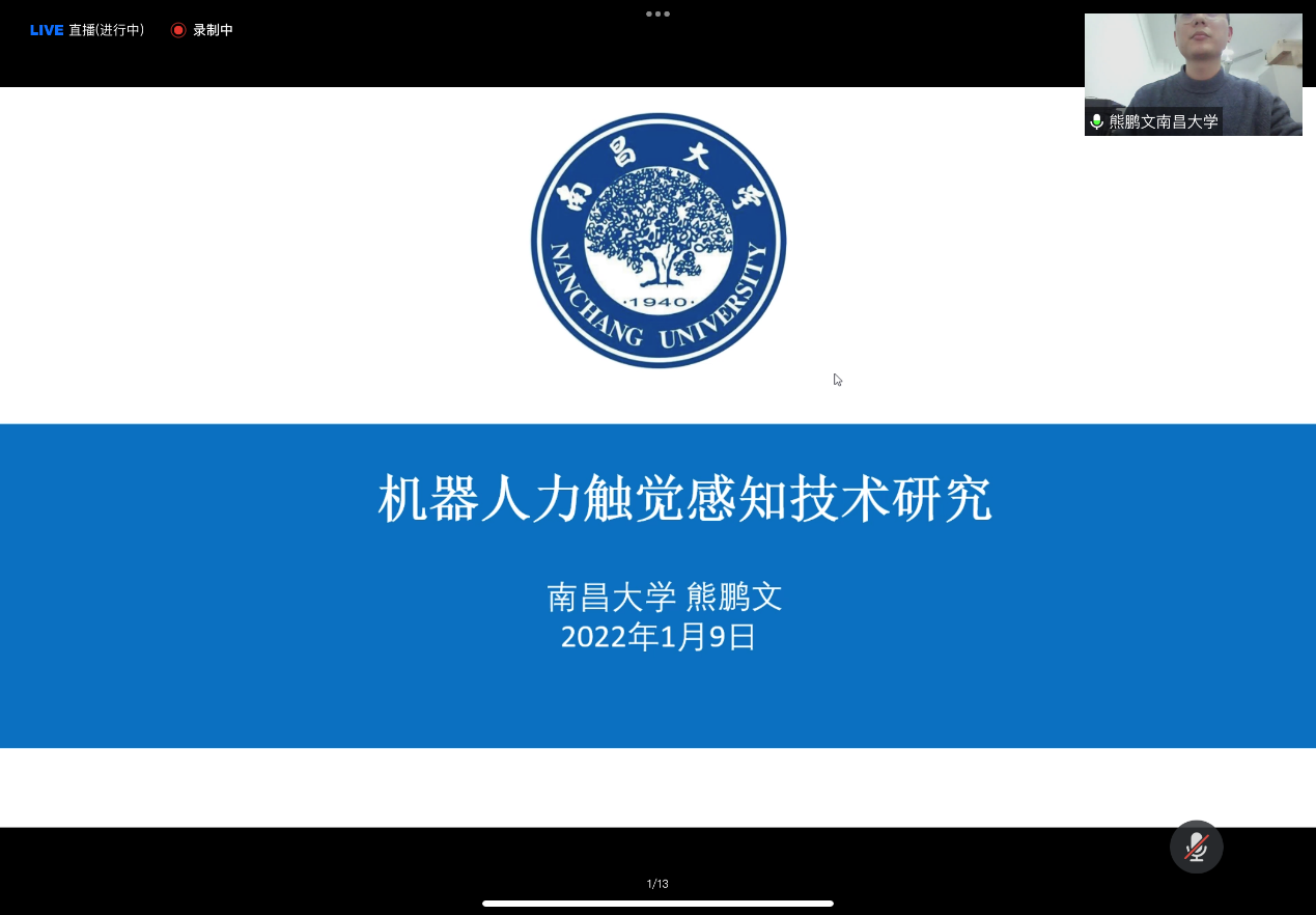 第二十四位报告人为来自南昌大学的熊鹏文副教授,报告题目为“机器人力触觉感知技术研究”。报告中,熊教授介绍了四个方面的主要研究:(1)机器人 FBG 力觉传感器与多模态触觉传感器研制—解决传统力触觉传感器感知局限性等问题。(2)基于跨模态学习的机器人多模态数据生成与检索方法研究—在机器人在缺乏视觉或触觉感知能力时,通过生成或检索操作赋予机器人缺失的感知能力。(3)基于多模态混合融合的机器人材料识别方法研究—提高机器人在多种异构混合测量模态下的材料感知能力(4)基于小样本耦合稀疏编码的机器人物体感知研究—提高机器人在缺乏充足样本数据环境下的物体感知能力。