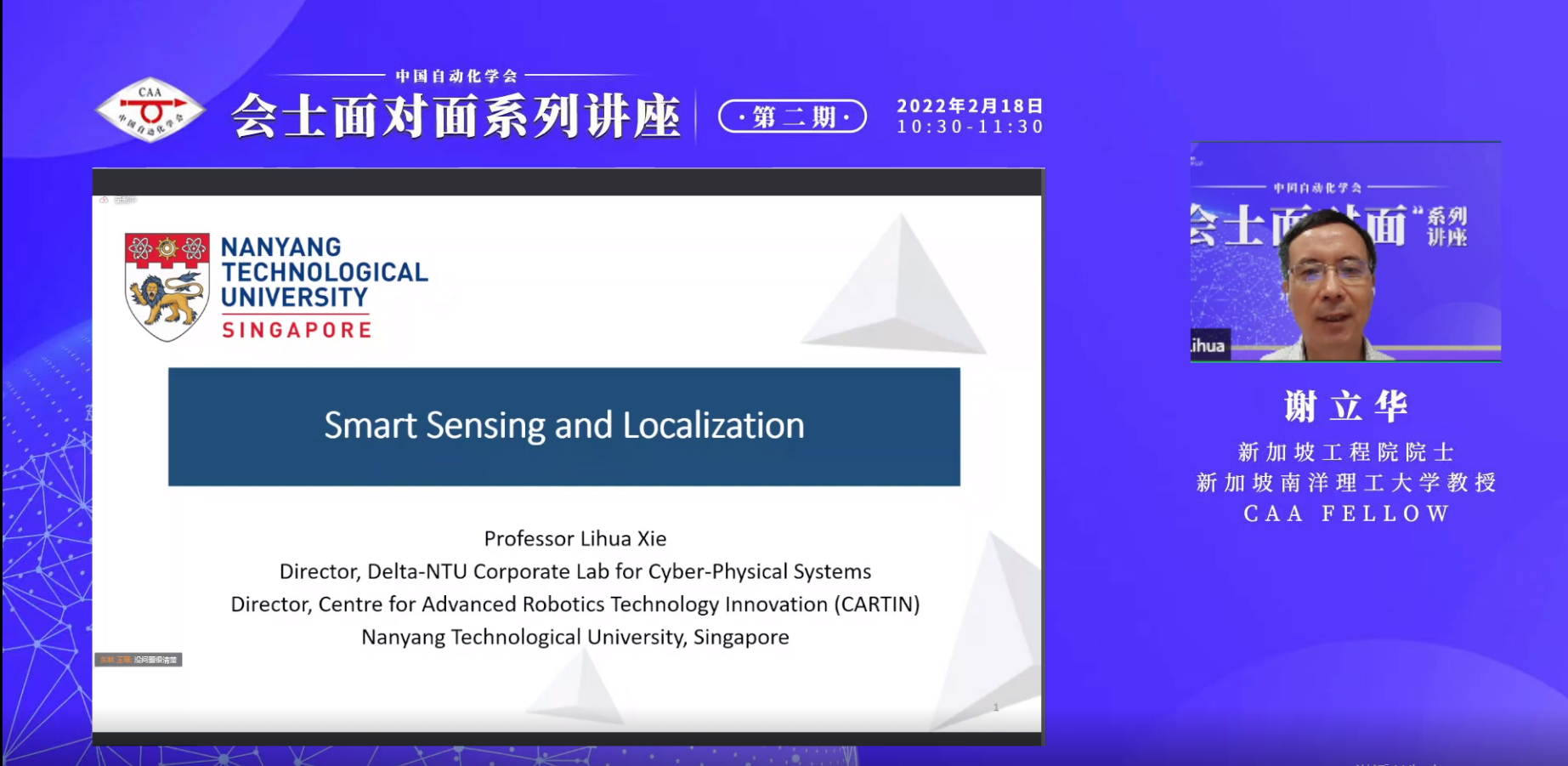 2022年2月18日上午,南洋理工大学谢立华教授做客“CAA会士面对面”作题为“智能感知和定位”的报告。感知和定位对于物联网与智能无人系统包括无人机和机器人至关重要。在定位方面,全球定位系统(GPS)已经被广泛应用于定位和导航。然而在室内和许多室外环境,如高楼林立的市区、遂道和森林,GPS通常不可靠或不存在。因此开发用于这些环境的定位技术和算法近年来引起了人们极大的兴趣。在本次的报告中,谢立华教授讨论了这方面的技术现状并重点介绍团队过去几年开发的几种智能感知和定位系统和算法:包括基于WiFi的室内定位和人的行为识别技术、基于UWB的定位以及用于定位和建图的视觉惯性距离传感器融合技术。除此之外,谢教授还介绍了这些定位技术在智能楼宇、智能家居、老年护理、结构检测和物流机器人等方面的应用。