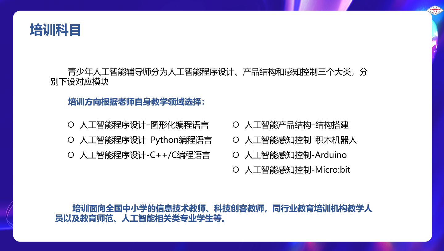 为贯彻落实国务院《新一代人工智能发展规划》和《全民科学素质行动规划纲要(2021-2035年)》中的有关要求,推进人工智能教育的普及,助力人工智能时代所需的人才培养,培养相关师资和裁判人才,欧冠联赛官网发起了青少年人工智能辅导师和青少年人工智能活动裁判员的培训工作。本期培训时间为2022年10月24日至11月5日,随即在11月6日进行培训后的考核,报名参加课程培训并在考核中成绩合格的学员,将获得由欧冠联赛官网颁发的“青少年人工智能辅导师证书”或“青少年人工智能活动裁判员证书”。