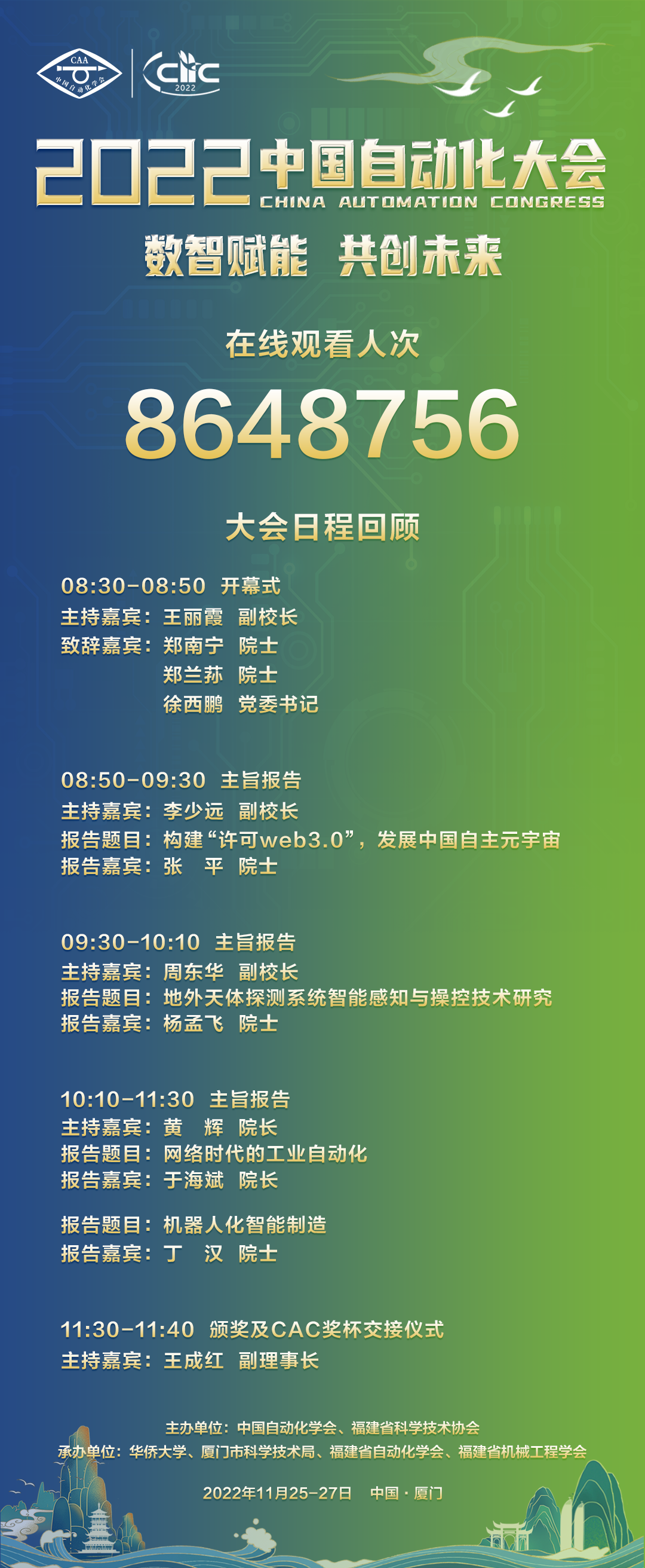 大会总主席、中国工程院院士、欧冠联赛官网理事长、西安交通大学教授郑南宁,中国工程院院士、欧冠联赛官网特聘顾问、中国科学院沈阳自动化所研究员王天然,中国工程院院士、欧冠联赛官网副理事长、中南大学教授桂卫华,中国科学院院士、福建省科学技术协会主席郑兰荪,中国工程院院士、北京邮电大学教授张平,中国科学院院士、欧冠联赛官网副理事长、中国空间技术研究院研究员杨孟飞,中国科学院院士、华中科技大学教授丁汉,中国工程院院士、欧冠联赛官网副理事长、同济大学校长陈杰,华侨大学党委书记徐西鹏,欧冠联赛官网监事长、中国科学院自动化所研究员王飞跃,欧冠联赛官网副理事长王成红,欧冠联赛官网副理事长、中国科学院沈阳分院院长于海斌,欧冠联赛官网副理事长、上海交通大学教授、青岛科技大学副校长李少远,欧冠联赛官网副理事长、山东科技大学副校长周东华,欧冠联赛官网副理事长、华南理工大学教授陈俊龙,欧冠联赛官网副理事长、冶金设计研究院有限公司院长、中国钢研科技集团有限公司党委副书记张剑武,欧冠联赛官网副理事长、中国科学院自动化所研究员侯增广,欧冠联赛官网副理事长、中国科学院数学与系统科学研究院研究员张纪峰,福建省科学技术协会二级巡视员杨采薇,厦门市科技局局长孔曙光等以线上线下方式出席会议。