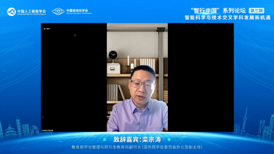 教育部学位管理与研究生教育司副司长、国务院学位委员会办公室副主任栾宗涛在致辞中强调:全球科技创新进入空前密集活跃期,新一轮科技革命和产业变革正在重构全球创新版图、重塑全球经济结构。我国正处于工业经济向数字经济、智能经济迈进的关键时期,人工智能日益成为引领。这一科技革命和产业变革的战略性技术成为推动中国经济转型、产业升级的重要推动力量。国务院学位委员会,教育部积极贯彻落实党中央、国务院部署要求,大力推进人工智能相关学科专业建设。栾司长希望论坛对交叉学科内涵、交叉学科边界和处理好学科之间关系等问题进行深入讨论。
