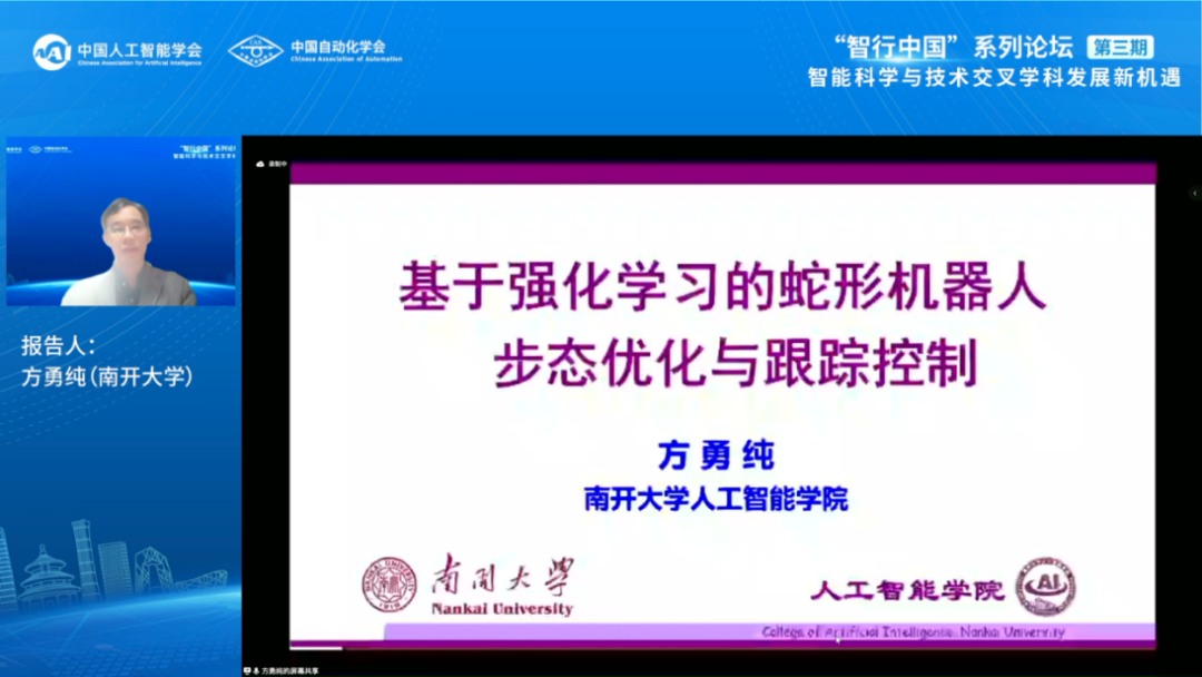 南开大学研究生院常务副院长方勇纯发表题为“基于强化学习的蛇形机器人步态优化与跟踪控制”的主旨报告,他指出与其他机器人相比,蛇形机器人可以在狭窄管道等环境中作业,因此具有广阔的应用前景,步态优化与跟踪控制是蛇形机器人实现高效作业的关键。他基于强化学习等方法,就蛇形机器人的步态优化与控制问题展开论述,具体包括基于强化学习的步态优化方法,以及基于强化学习的蛇形机器人跟踪控制方法。