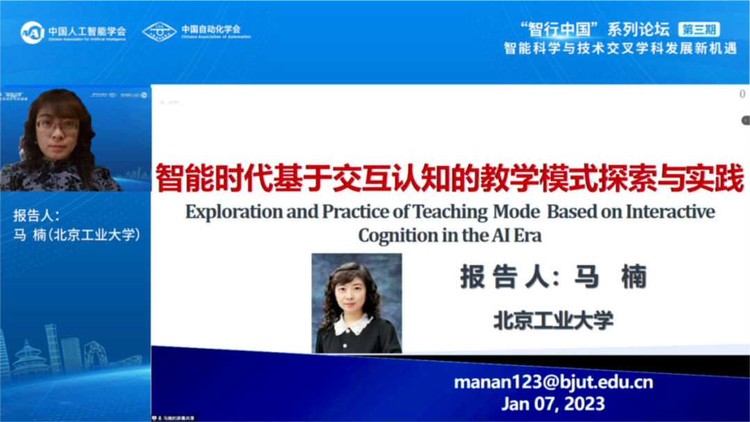 中国人工智能学会副秘书长、智能感知与自主控制教育部工程中心副主任,北京工业大学马楠发表题为“智能时代基于交互认知的教学模式探索与实践”的主旨报告,分为智能时代的教育特点、AI赋能教育-在交互认知中成长学习、新工科人才体系培养探索和智能交互技术产学研建设四部分,从交互认知研究领域到科学任务引领以及如何围绕专业课程建设新形态教材、在线课程、教具、教学案例和虚拟仿真实践教学平台,如何培养创新型人才进行了详细报告。