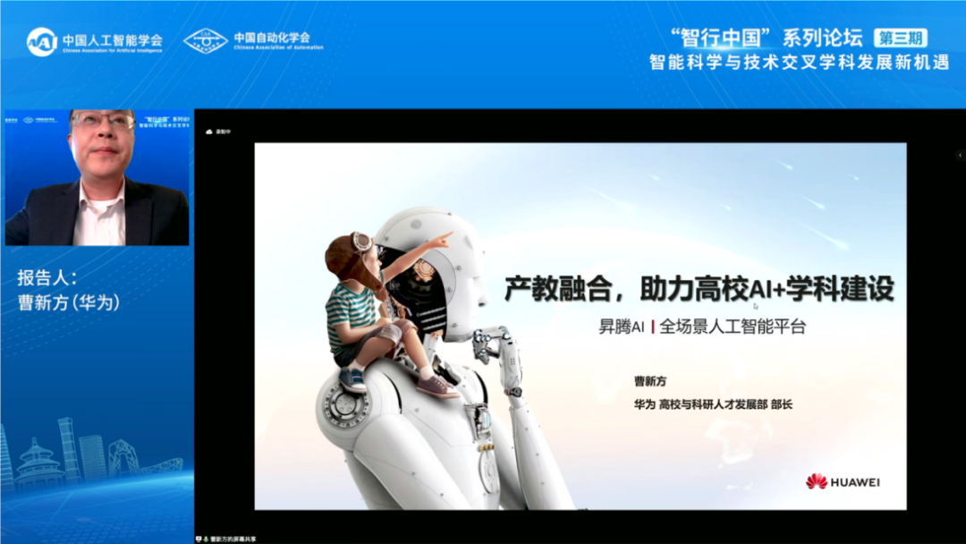 华为计算产品线高校与科研人才发展部部长曹新方发表题为“产教融合,助力高校AI+学科建设”的主旨报告,他从华为在人工智能产业的前沿技术融入高校教学体系,共同探索AI+学科的建设,助力高校培养新时代需要的复合型人才等方面进行了详细报告。