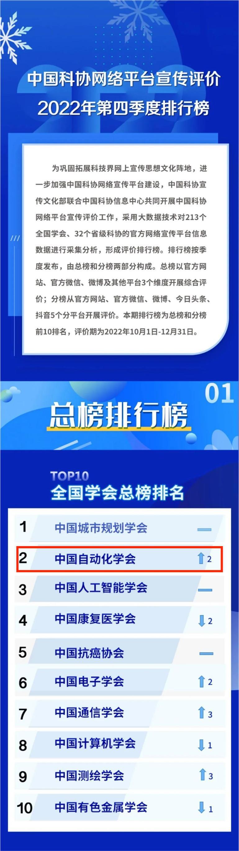 近日,中国科协发布网络平台宣传评价2022年第四季度排行榜。中国科协宣传文化部联合中国科协信息中心共同开展中国科协网络平台宣传评价工作,采用大数据技术对213个全国学会、32个省级科协的官方网络宣传平台信息数据进行采集分析,形成评价排行榜。