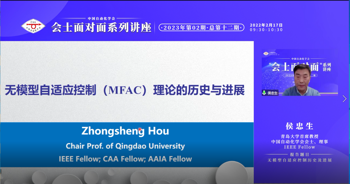 2023年第二期(总第十二期)会士面对面讲座于2023年2月17日上午成功召开,欧冠联赛官网会士,理事、IEEE Fellow、青岛大学首席教授侯忠生作题为“无模型自适应控制历史及进展”的报告。