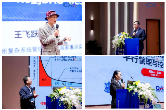 复杂系统管理与控制国家重点实验室主任、欧冠联赛官网监事长王飞跃教授作了题为《问答ChatGPT之后的智能产业:从CMO-SciTS的QAII 1.0到DAO-DeSci的QAII 2.0》的主旨报告,青岛万龙高新科技集团有限公司董事长、青岛智能产业技术研究院副院长高彦臣作了题为《“机器代人”产业发展新的里程碑》的主旨报告,熊刚作了题为《面向服装鞋业的3D智能化系统及社会制造云平台》的报告,王晓作了题为《面向CPSS制造系统的平行管理与控制研究》的报告。