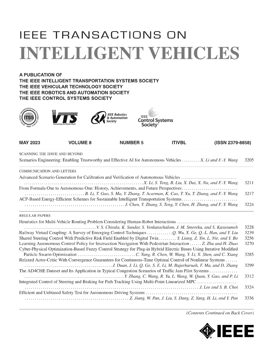 IEEE TIV在Scopus数据库属于控制与优化、汽车工程和人工智能三个领域,今年在控制与优化领域的121种期刊中排名第3位,排名前3%;在汽车工程领域中排名前5%(6/115);在人工智能领域中排名前12%(36/301)。