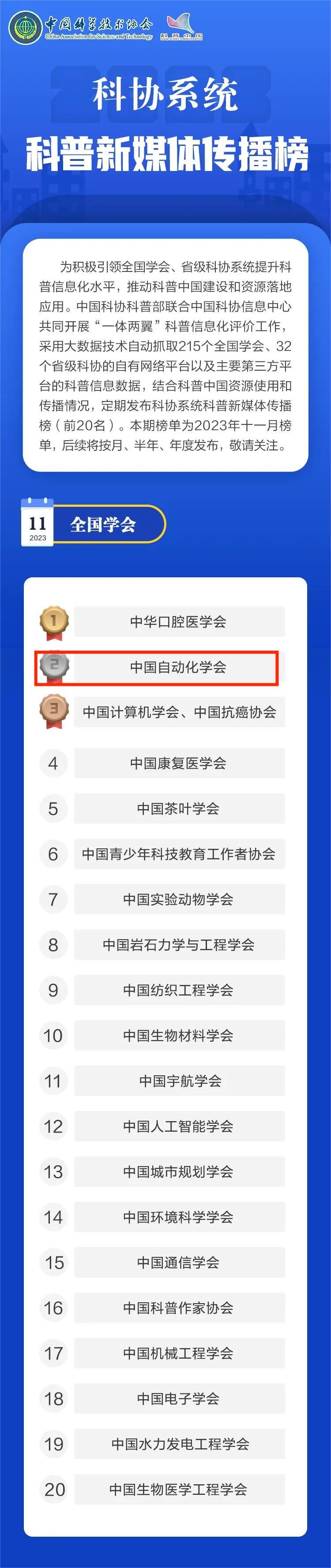 近日,中国科协发布11月科协系统科普新媒体传播榜。中国科协科普部联合中国科协信息中心共同开展“一体两翼”科普信息化评价工作,采用大数据技术自动抓取215个全国学会、32个省级科协的自有网络平台以及主要第三方平台的科普信息数据,结合科普中国资源使用和传播情况,定期发布科协系统科普新媒体传播榜(前20名)。