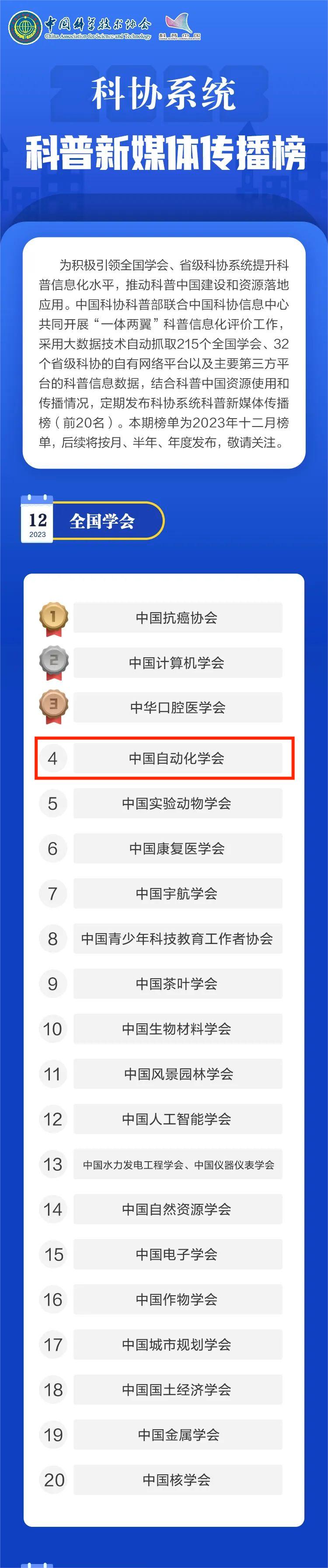 今日,中国科协发布2023年12月科协系统科普新媒体传播榜。中国科协科普部联合中国科协信息中心共同开展“一体两翼”科普信息化评价工作,采用大数据技术自动抓取215个全国学会、32个省级科协的自有网络平台以及主要第三方平台的科普信息数据,结合科普中国资源使用和传播情况,定期发布科协系统科普新媒体传播榜(前20名)。