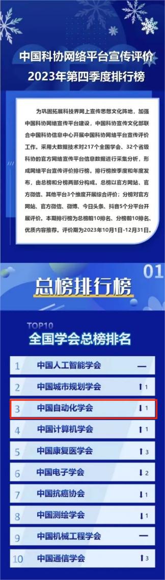 近日,中国科协发布网络平台宣传评价2023年第四季度排行榜。中国科协宣传文化部联合中国科协信息中心开展中国科协网络平台宣传评价工作,采用大数据技术对217个全国学会、32个省级科协的官方网络宣传平台信息数据进行采集分析,形成网络平台宣传评价排行榜。
