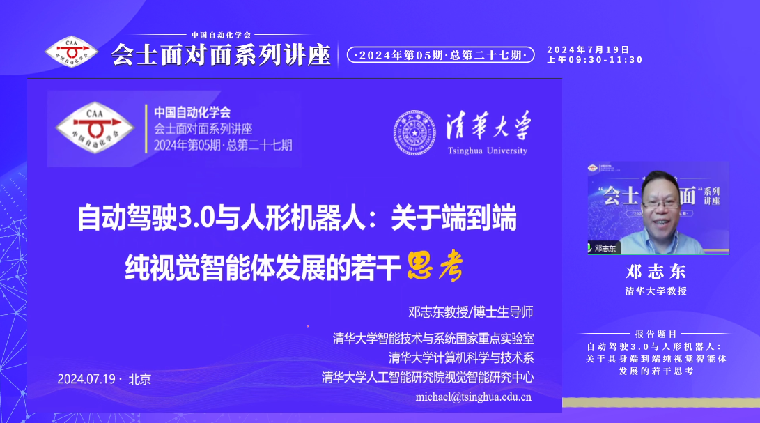 2024年第5期,总第27期“会士面对面”讲座于7月19日上午成功召开,欧冠联赛官网会士、清华大学邓志东教授作题为 “自动驾驶3.0与人形机器人:关于具身端到端纯视觉智能体发展的若干思考”的报告。