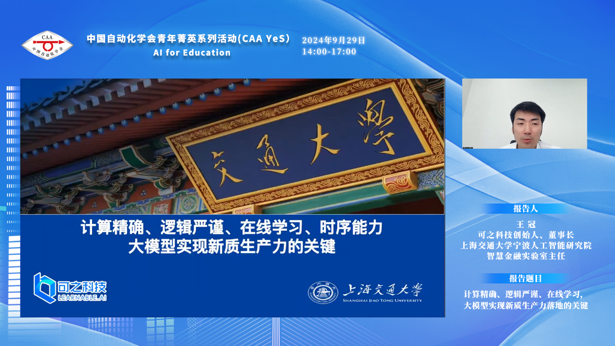可之科技创始人与董事长、上海交通大学宁波人工智能研究院智慧金融实验室主任王冠的报告题目为“计算精确、逻辑严谨、在线学习,大模型实现新质生产力落地的关键”,他介绍了自主研发的技术路线Symbolic Pretrained Transformer,该路线为解决通用大模型计算不准确、逻辑不严谨、无法在线迭代自我进化这一难题找到了可行方向。