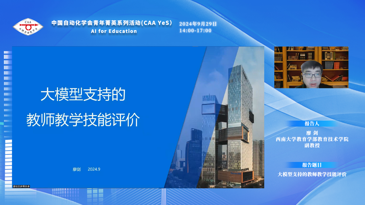 西南大学教育学部教育技术学院副教授廖剑的报告题目为“大模型支持的教师教学技能评价”,他分享了如何利用大模型对教师的教学设计、课堂语言、教学行为和学习效果等多维度进行智能评估,并结合具体应用案例,展示了其在教育评价中的优势。