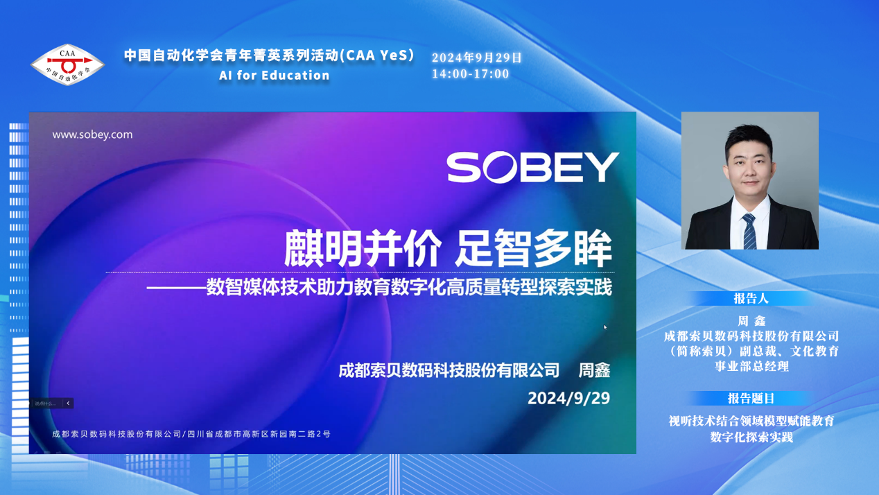 成都索贝数码科技股份有限公司副总裁、文化教育事业部总经理周鑫的报告题目为“视听技术结合领域模型赋能教育数字化探索实践”,他重点介绍了索贝自主研发的“明眸”领域模型、“麒智”视听智能处理架构如何支撑现代教育技术发展下的新场景,以及视频大模型方向的一些最新研究进展。