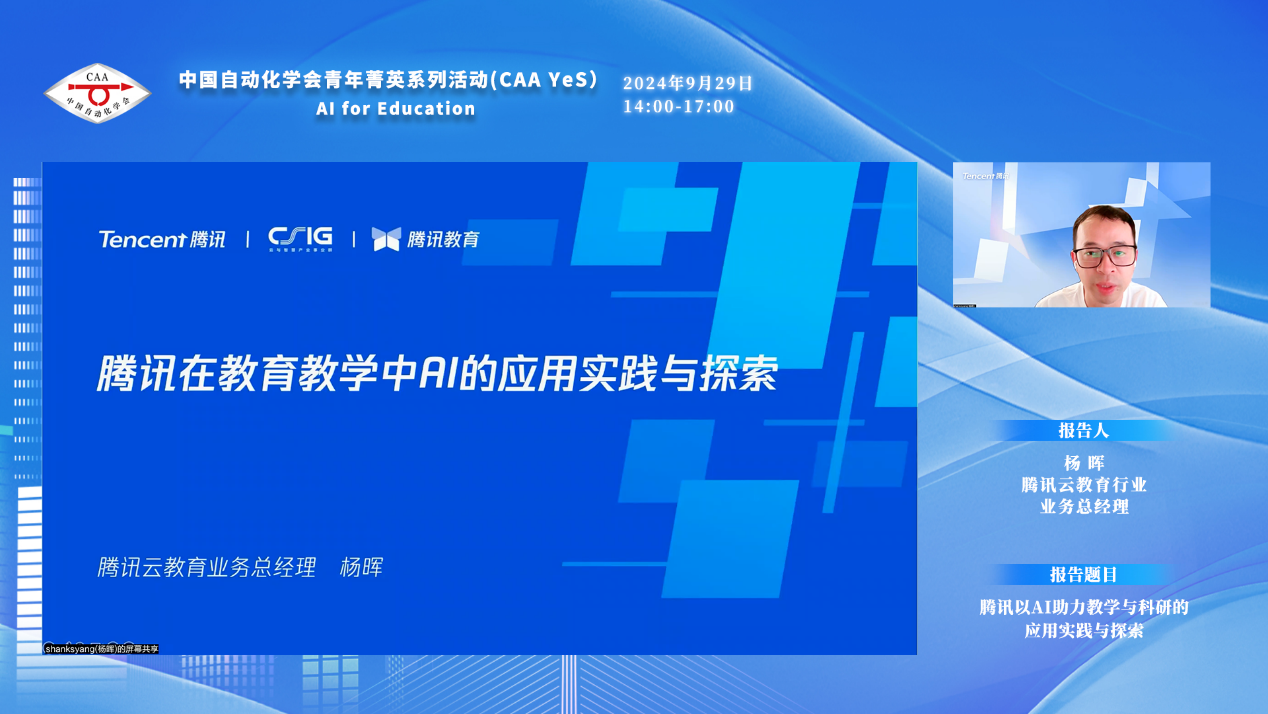 腾讯云教育行业业务总经理杨晖的报告题目为“腾讯以AI助力教学与科研的应用实践与探索”,他介绍了腾讯在科研领域的科学计算云平台、在高校人才培养领域的产业实训工具以及在AI助力教学变革领域的AI Agent创作平台。