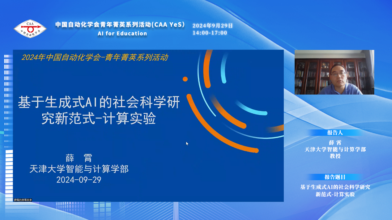 天津大学智能与计算学部教授薛霄的报告题目为“基于生成式AI的社会科学研究新范式——计算实验”,他分享了基于生成式Agent的计算实验方法,其核心理念是“生成式解释”,该方法旨在应对智能社会治理领域,由演化复杂性、关联复杂性与调控复杂性引发的一系列问题与挑战。