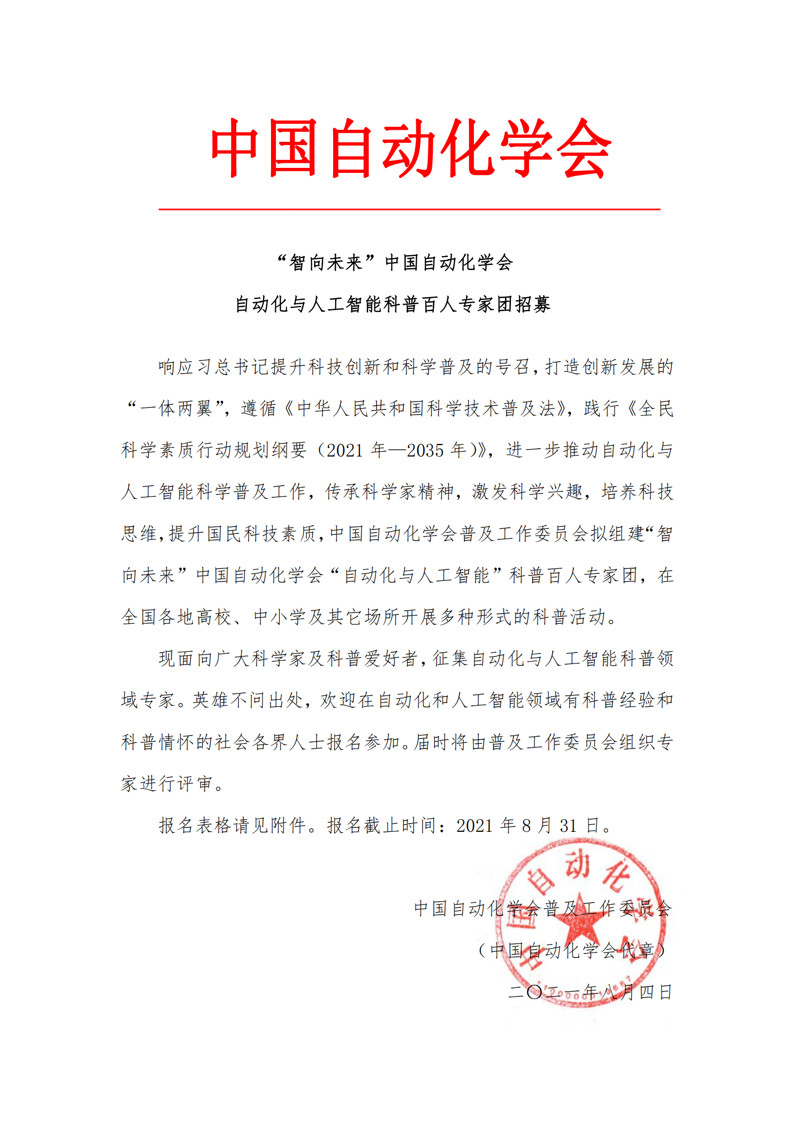 响应习总书记提升科技创新和科学普及的号召,打造创新发展的“一体两翼”,遵循《中华人民共和国科学技术普及法》,践行《全民科学素质行动规划纲要(2021年—2035年)》,进一步推动自动化与人工智能科学普及工作,传承科学家精神,激发科学兴趣,培养科技思维,提升国民科技素质,欧冠联赛官网普及工作委员会拟组建“智向未来”欧冠联赛官网“自动化与人工智能”科普百人专家团,在全国各地高校、中小学及其它场所开展多种形式的科普活动。