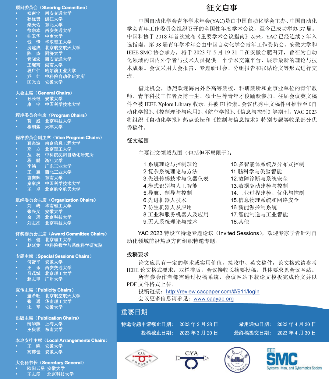 欧冠联赛官网青年学术年会(YAC)是由欧冠联赛官网主办、欧冠联赛官网青年工作委员会组织召开的全国性年度学术会议,至今已成功举办37届。中国科协于2018年首次发布《重要学术会议指南》以来,YAC 已经连续5年入选指南。第38届青年学术年会由欧冠联赛官网青年工作委员会、安徽大学和IEEE SMC 协会承办,将于2023 年5月19-21日在安徽合肥召开,旨在为自动化领域的国内外学者与技术人员提供一个学术交流平台,展示最新的理论与技术成果。会议采用大会报告、专题研讨会、分组报告和张贴论文等形式进行交流。